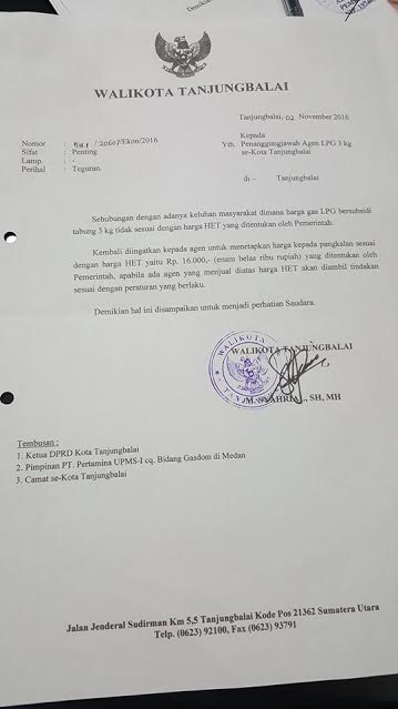 Walikota Tanjungbalai Nomor: 511.1/20607/Ekon/2016 tertanggal 2 Nopember 2016.
