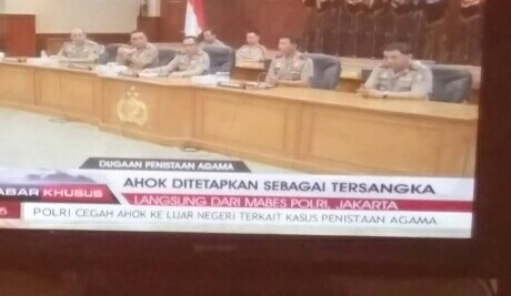 Seperti disiarkan secara live di TVOne, Kabareskrim Komjen Ari Dono mengumumkan bahwa Ahok ditetapkan jadi tersangka penistaan agama.