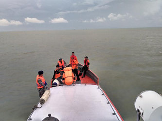 Petugas Gabungan Basarnas Airud dan TNI AL saat melakukan pencarian kepada 4 orang nelayan yang dikabarkan hilang terbawa arus di Perairan Selat Malaka.