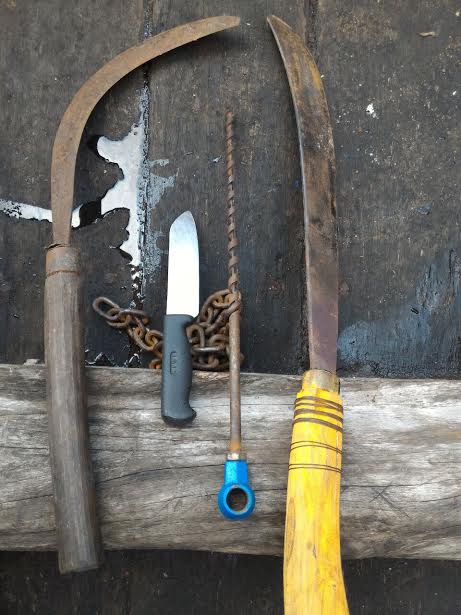 Nibung bersama barang bukti obor, petasan, golok, celurit dan pisau.