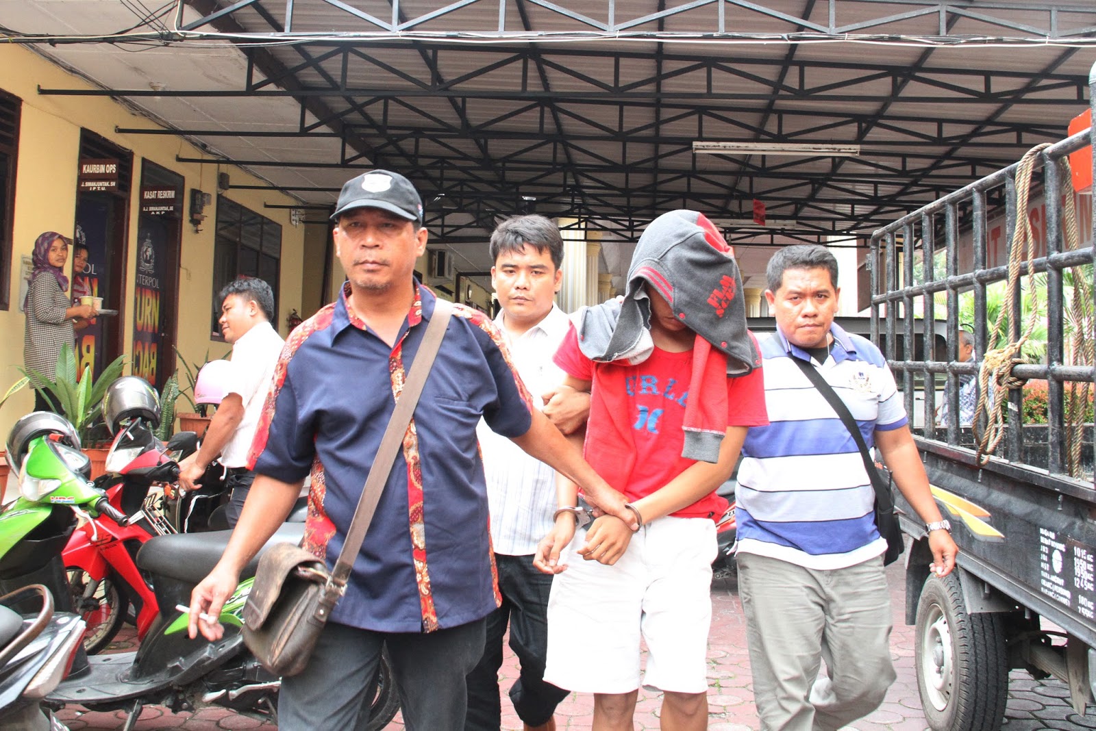 Amatan di Polres Pematangsiantar, begitu tiba, RIS yang tangannya diborgol langsung dibawa menuju ruangan PPA. Wajahnya juga ditutupi menggunakan baju yang diikatkan.