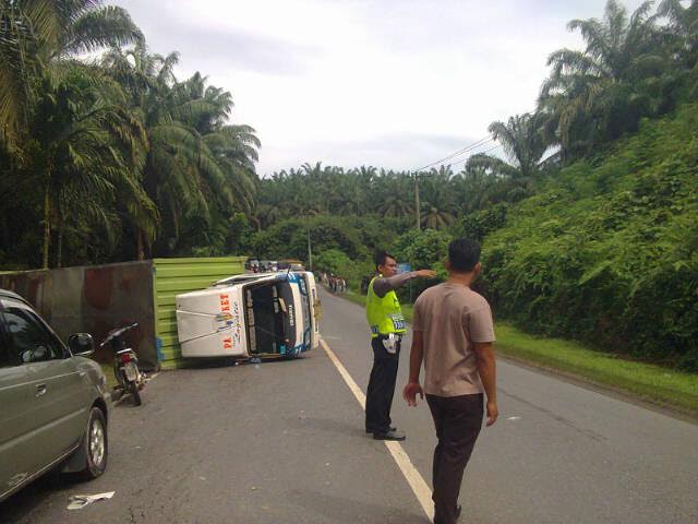 Sementara itu, sekitar satu jam setelah truk yang dikemudikan Chandra terbalik, tepatnya sekita pukul 06.00 WIB, truk B 9003 UCM yang dikemudikan Kholid warga Jawa Barat yang bermuatan roti juga terbalik di Jalinsum Sinar Pagi.