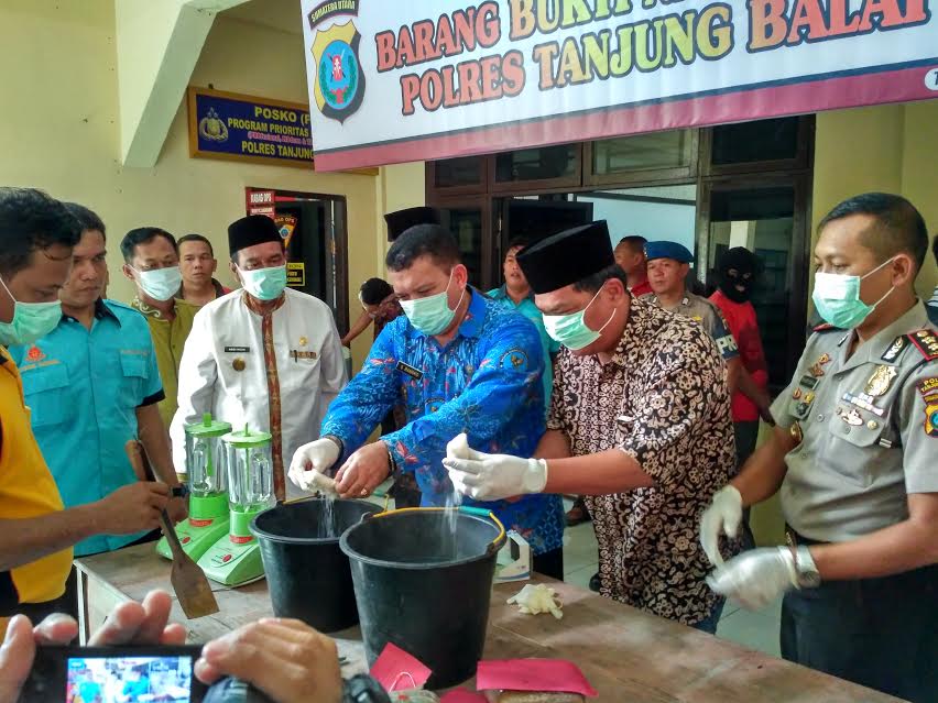 Kapolres Tanjungbalai AKBP Tri Setyadi Artono bersama unsur FKPD saat melakukan pemusnahan barang bukti narkoba. (riki/ASAHAN)