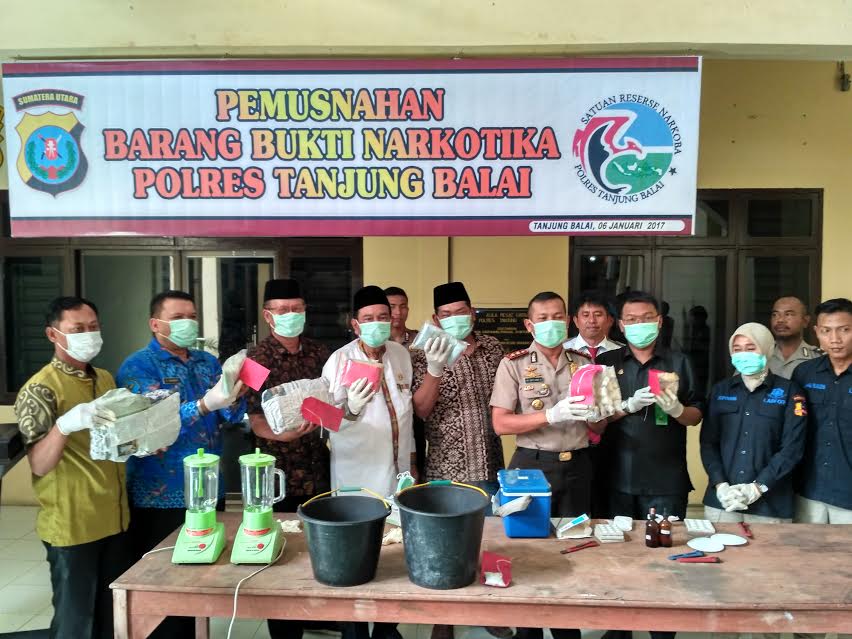 TANJUNGBALAI-Sebanyak 1.867,4 gram narkotika jenis sabu, 968 gram narkotika jenis Heroin, 4.076 butir pil ekstasi serta 3.654,55 gram ganja yang diamankan dari sembilan orang tersangka dimusnahkan Polres Tanjungbalai. Acara pemusnahan dilakukan di Hall Polres Tanjungbalai di Jalan Jenderal Sudirman, Jum’at (6/1).