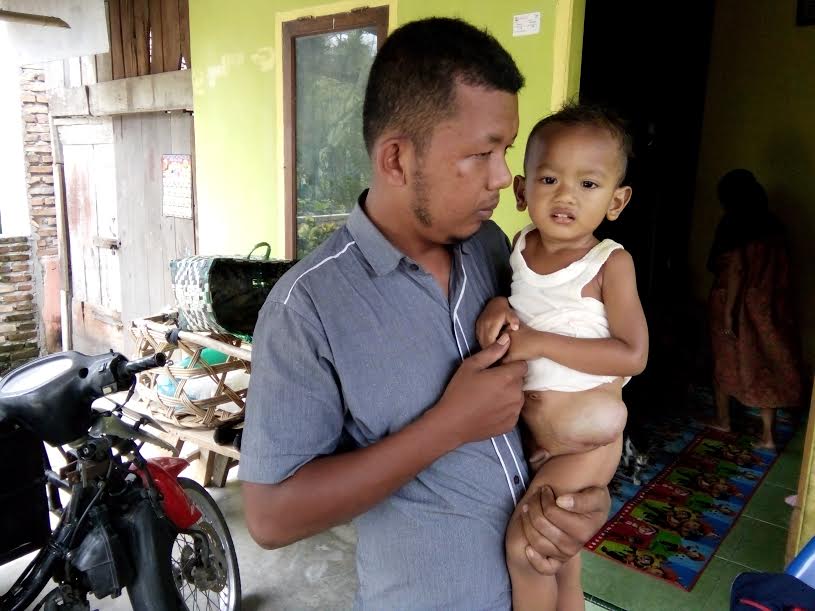 Ahmad Gibran Ubay Dillah 1 tahun 9 bulan bocah penderita tumor Yolk Sac, Senin (27/2). Bantuan ini sebagai bentuk rasa kepedulian mereka terhadap penderitaan yang dialami bocah malang tersebut.
