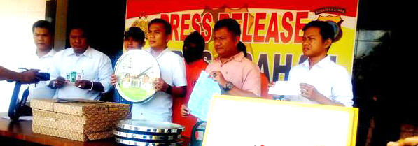 ASAHAN-Dua tersangka pelaku pemerasan dan pengemplang dana Bantuan Operasional Sekolah (BOS) dengan modus berdagang jam dinding bergambar Bupati Asahan Taufan Gama Simatupang dan Wakil Bupati Surya, serta bener bergambar denah sekolah diamankan. Keduanya mengaku dari hasil usahanya mereka meraih keuntungan Rp100 juta dari sekolah sekolah yang ada di Asahan. Kedua tersangka yakni Heri Noto (42) dan Sofyan Batu Bara (42).