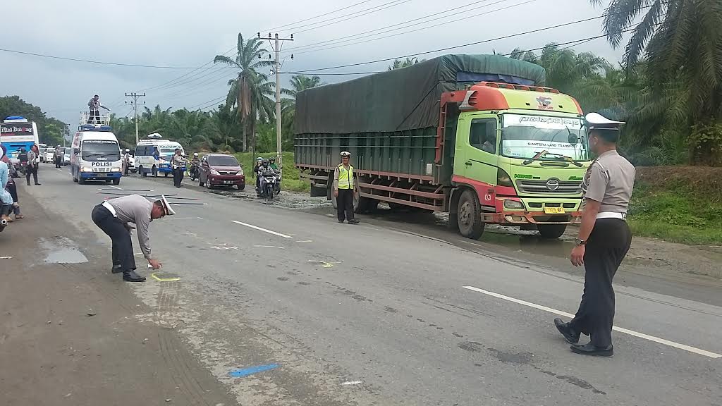 “Kami lihat mobil patroli itu datang dari arah Kisaran dengan kecepatan tinggi diperkirakan lagi mengejar truk membawa sayuran. Pas tiba-tiba di depan sebuah rumah makan ada satu truk Colt Diesel yang berhenti hendak berangkat dan memasuki badan jalan. Mungkin karena gugup ada truk di depan, mereka banting setir ke kiri dan langsung mengenai bagian belakang bak sebelah kanan truk Colt Diesel yang sedang parkir di bahu jalan itu,” terang FI (35) dan UN (36) warga setempat.
