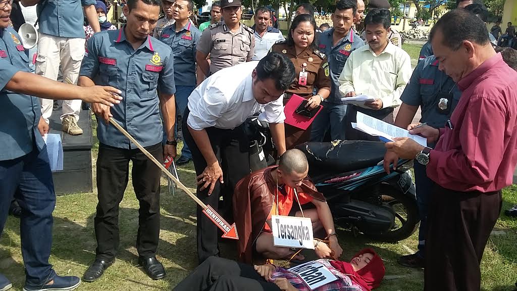 Rekontruksi juga tampak menjadi tontonan puluhan warga yang ikut menyaksikan dari balik pagar Mapolres Batubara.