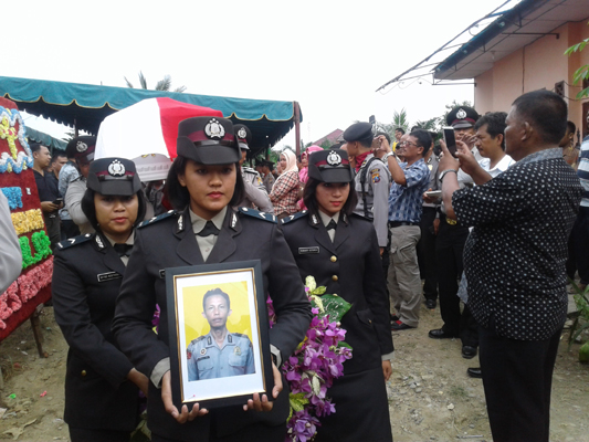 Almarhum Aiptu Sawal Fernando Sirait dimakamkan dengan upacara pemakaman kedinasan kepolisian. Suasana haru, namun tetap khidmat menyelimuti pemakaman tersebut.