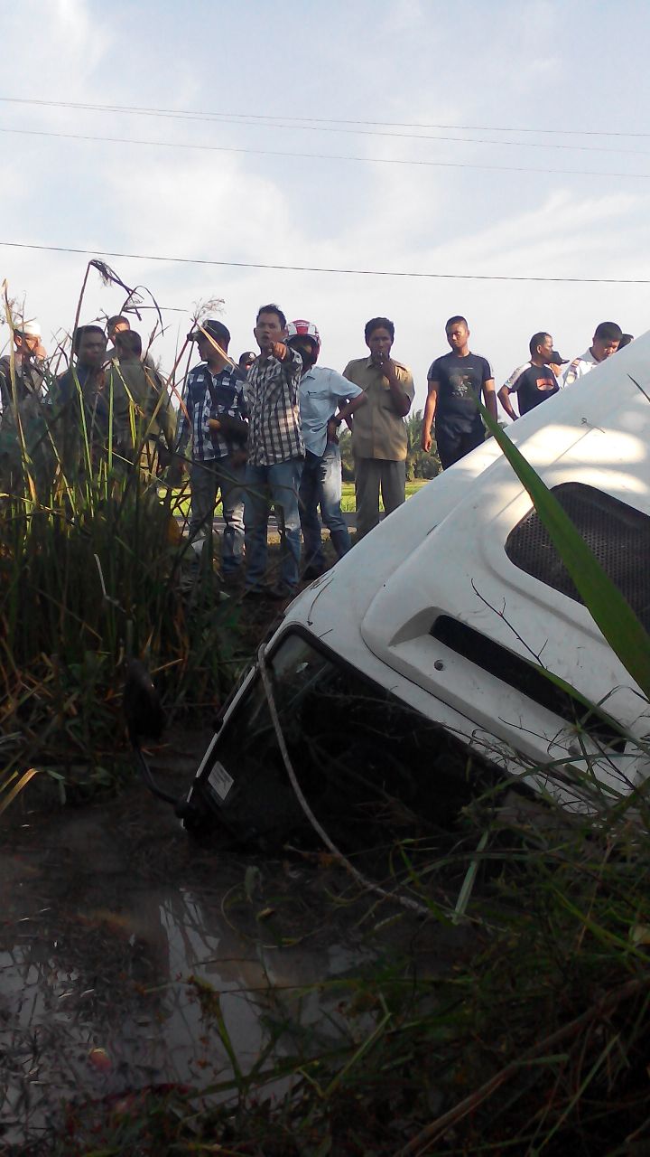 “Saya lihat bus itu melaju sedang dengan posisi ke 2 ban sebelah kiri terangkat, kemudian masuk ke parit. Padahal jalanan sepi di sini bang. Lalu kami menghampiri bus itu dengan kondisi sudah separuh masuk ke parit yang digenangi air,” ucap Sihol, seorang warga di lokasi.