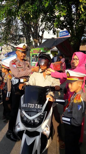 TANJUNGBALAI-Melihat banyaknya pengendara sepedamotor dan juga penumpang sepedamotor yang masih tidak menggunakan helm, khususnya pelajar dan anak-anak menimbulkan keprihatinan tersendiri bagi ibu-ibu Bhayangkari dan sat lantas Polres Tanjungbalai.