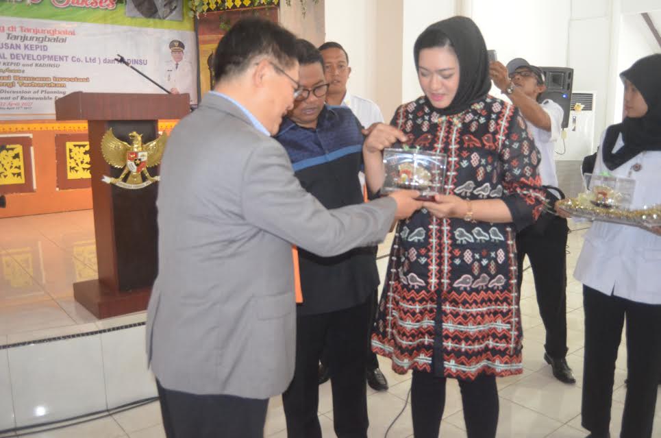 memberikan cenderamata kepada pengusaha dari Korea yang datang ke Tanjungbalai.