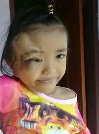 “Sejak lahir anak ku sudah ada benjolan sebesar anggur di mata sebelah kanannya. Waktu umur 11 bulan benjolan itu semakin besar bahkan besarnya seperti buah kelapa,” bebernya.