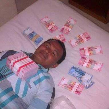 Terlihat juga lembaran kertas menyerupai uang pecahan Rp 100 ribu dan Rp 50 ribu memenuhi lantai kamar dan tempat tidur. Seorang pria sedang tidur telentang seorang diri di atas kasur yang dipenuhi tumpukan kertas menyerupai uang.