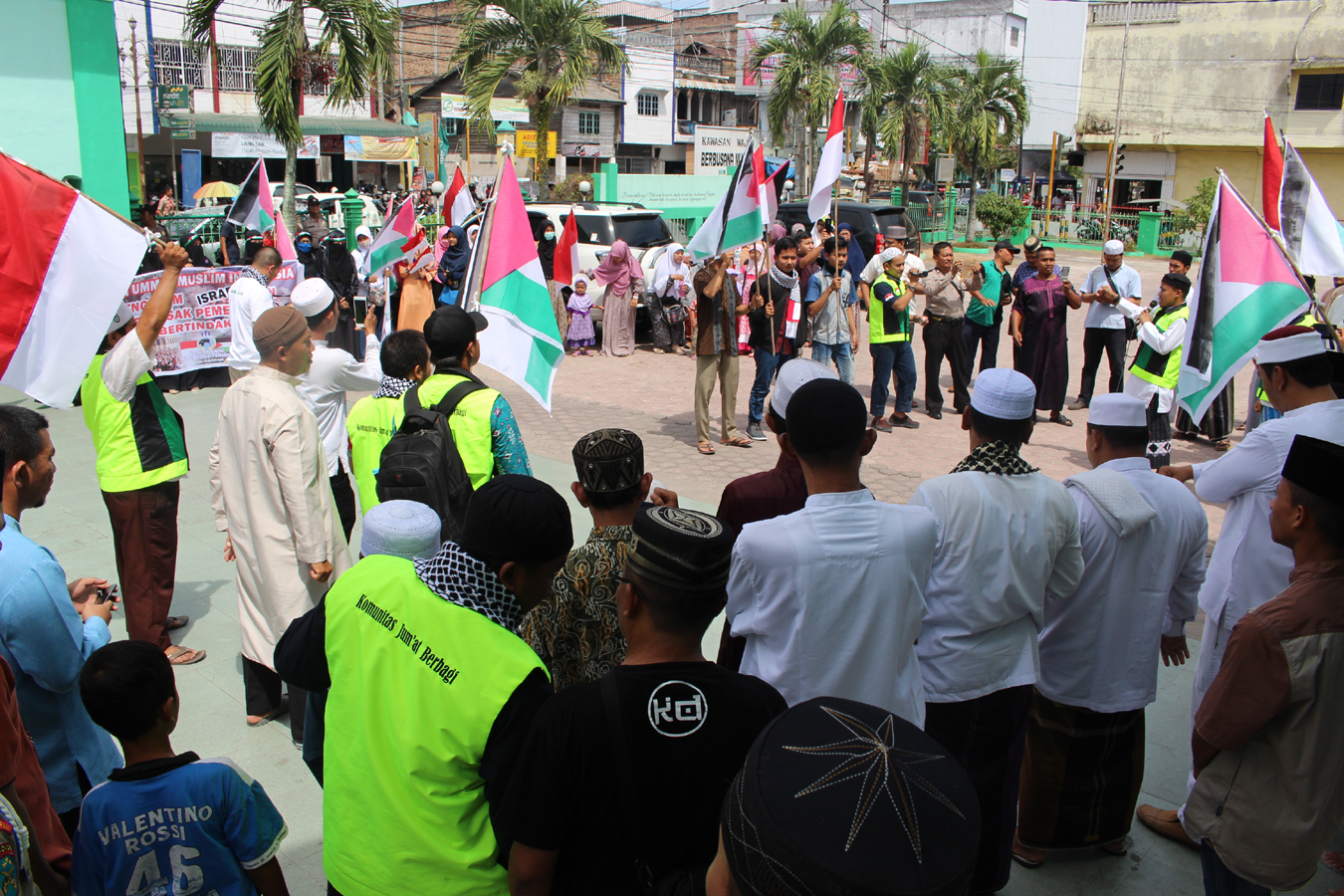 “Kita yang hadir disini memiliki kewajiban yang sama untuk sama sama peduli dan membantu saudara saudara kita yang ada di Palestina. Kita juga hadir disini, untuk sama sama memperjuangkan Masjid Al-Aqsha dari cengkraman zionis Israel” ujar Ustad Ahmad Qosim Marpaung membuka orasi ditengah massa yang berkerumun.