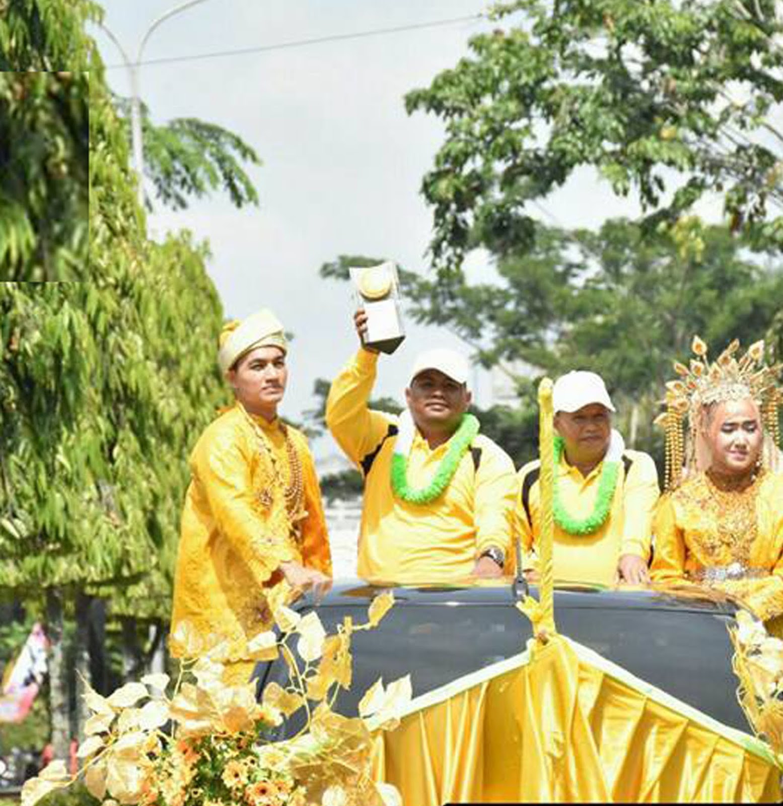 | Walikota Tanjungbalai M Syahrial dan Wakil Walikota Ismail menaiki mobil hias membawa piala Adipura keliling kota. |