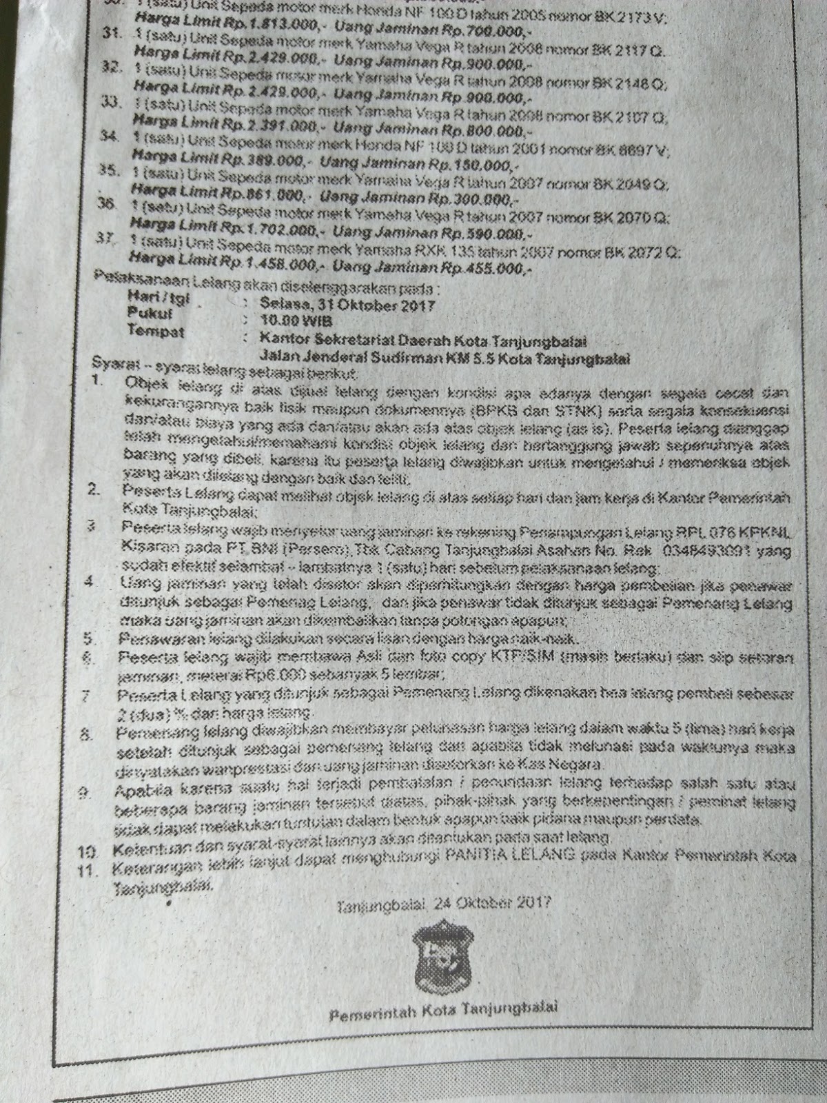 melaksanakan lelang kenderaan bermotor milik Pemko Tanjungbalai yang akan