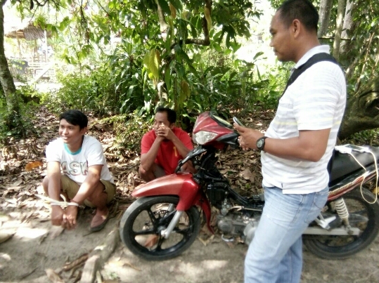 Ipda Syamsul Adhar SH saat menginterogasi Otto (kaos putih) dan M Aripin (kaos merah) di lokasi penggerebekan.