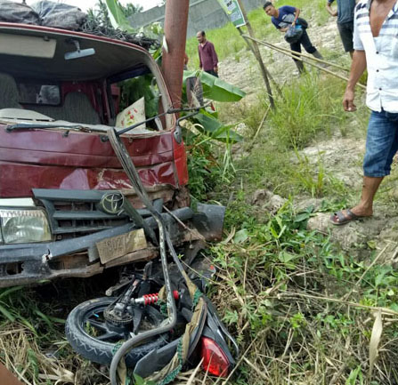 tepat menghantam bagian depan dump truck. Tak ayal, keduanya langsung terkapar