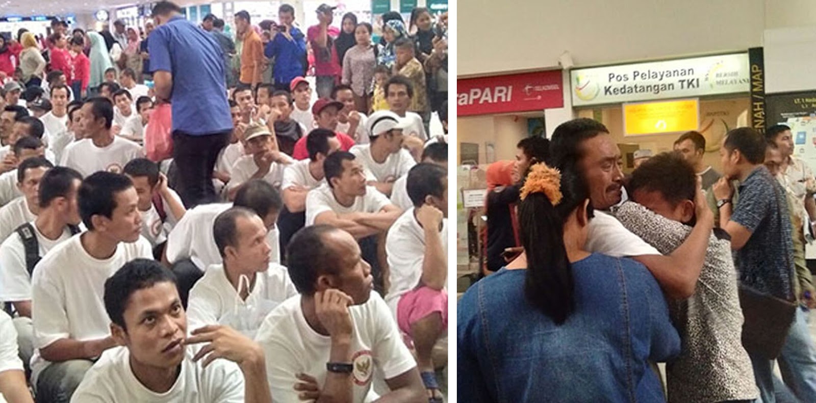 Para TKI yang dipulangkan saat mendapat pengarahan. Keluarga menyambut para TKI yang baru dipulangkan dari Malaysia dengan isak tangis. |