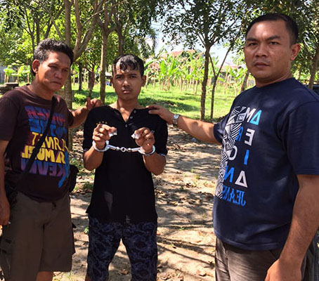 Tersangka saat diringkus polisi di kebun milik warga. |