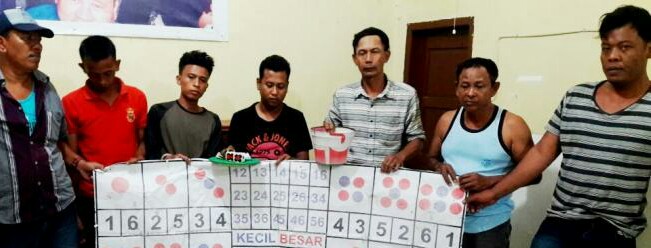 “Dari penangkapan tersebut dapat diamankan sebanyak tujuh orang tersangka dengan barang bukti yang dapat disita sebagai barang bukti diantaranya beberan yang terbuat dari karpet dengan tulisan angka pasangan atau tebakan, satu buah mangkok , satu buah piring, tiga buah mata dadu, ” urainya.