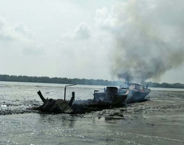 Salahsatu kapal pukat yang dibakar nelayan tradisional.
