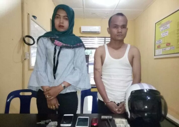 Pasutri specialis pencuri jok sepedamotor yang diamankan polisi.