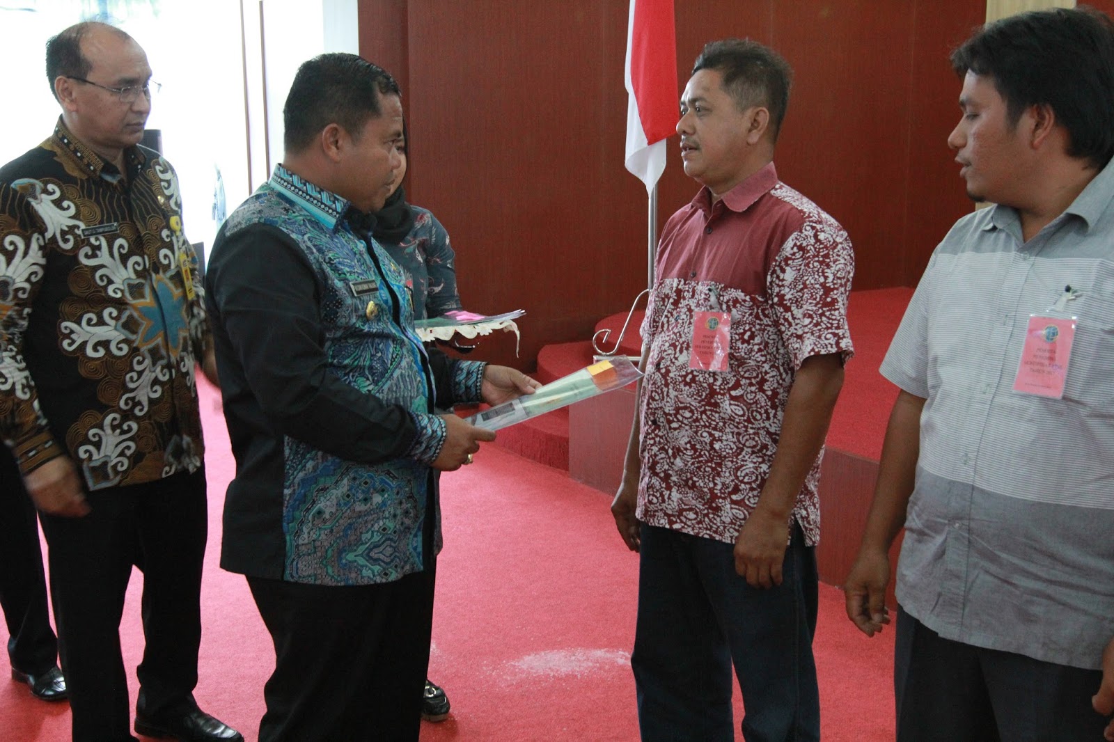 Pihak BPN menyerahkan sertifikat tanah secara simbolis kepada warga Labusel. |