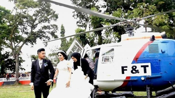saat helikopter berada di Lapangan H Adam Malik, sepasang pengantin mendekati