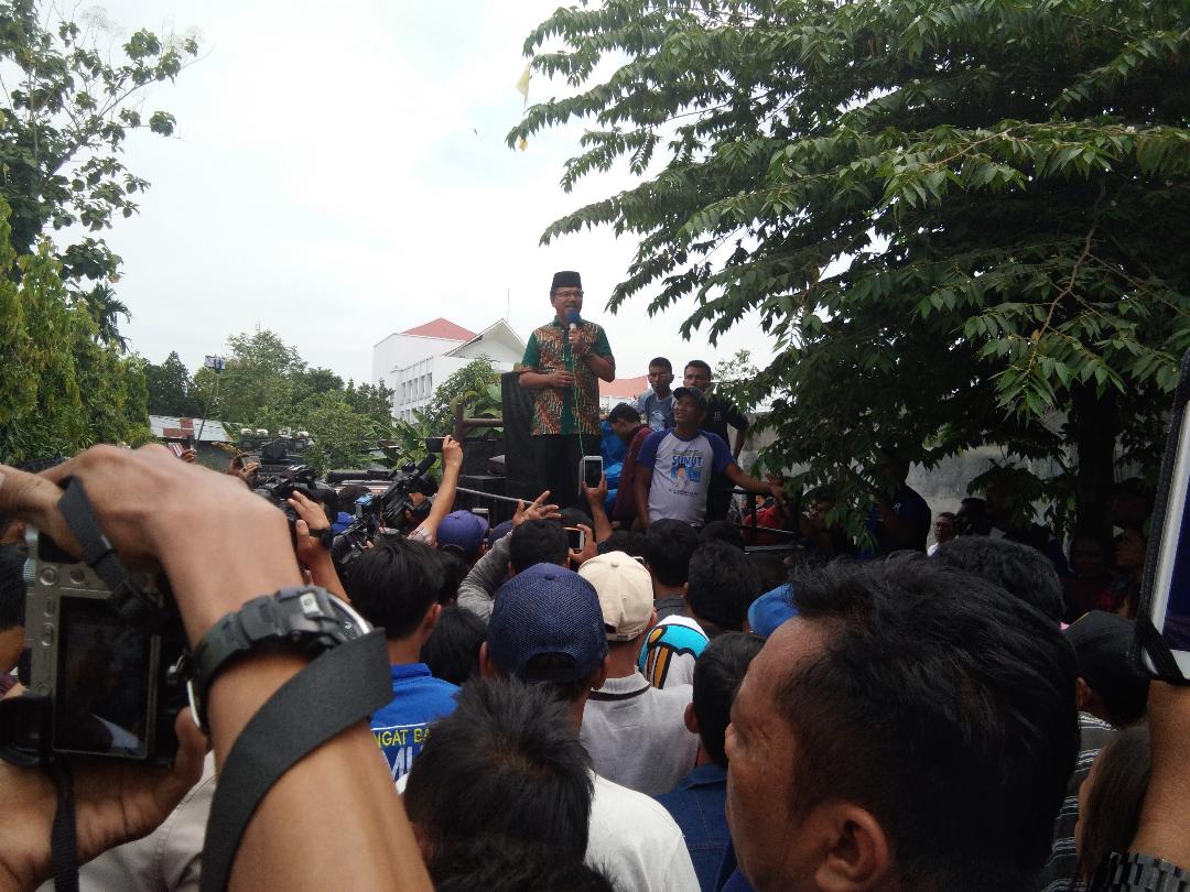 Massa pendukung JR Saragih memadati kantor kejaksaan tinggi Sumatera Utara. |