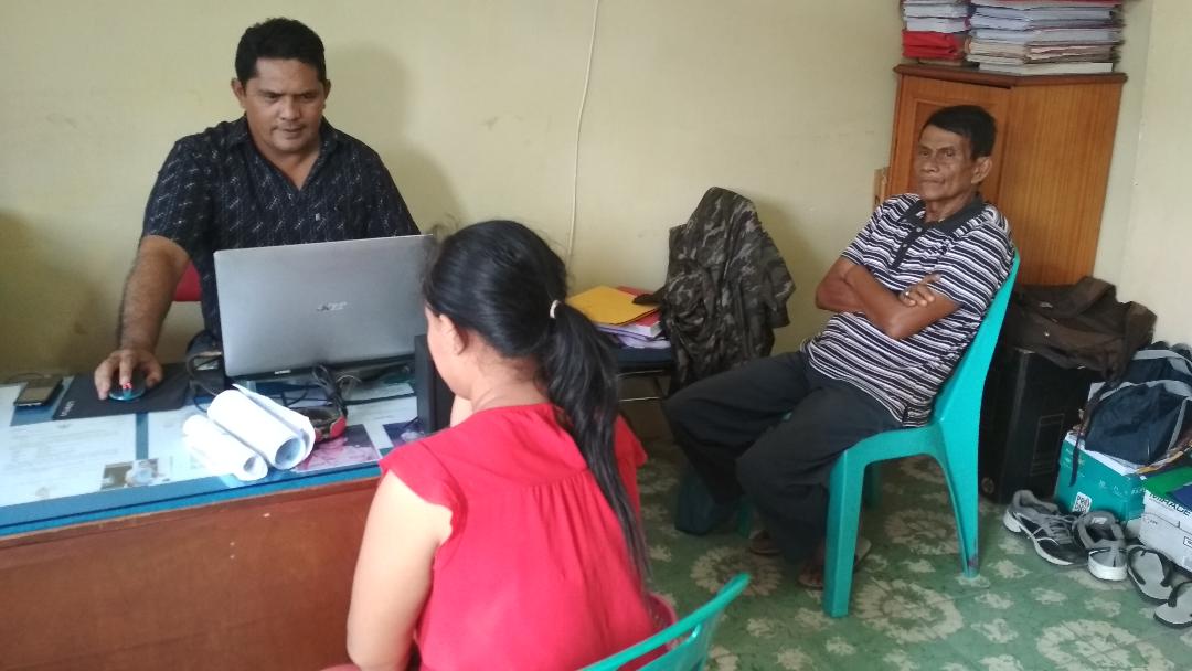 | Pelaku cabulk (Baju kaos garis-garis di sebelah kanan) mendengarkan pengakuan ibu korban pencabulan yang dimintai keterangannya oleh polisi. |