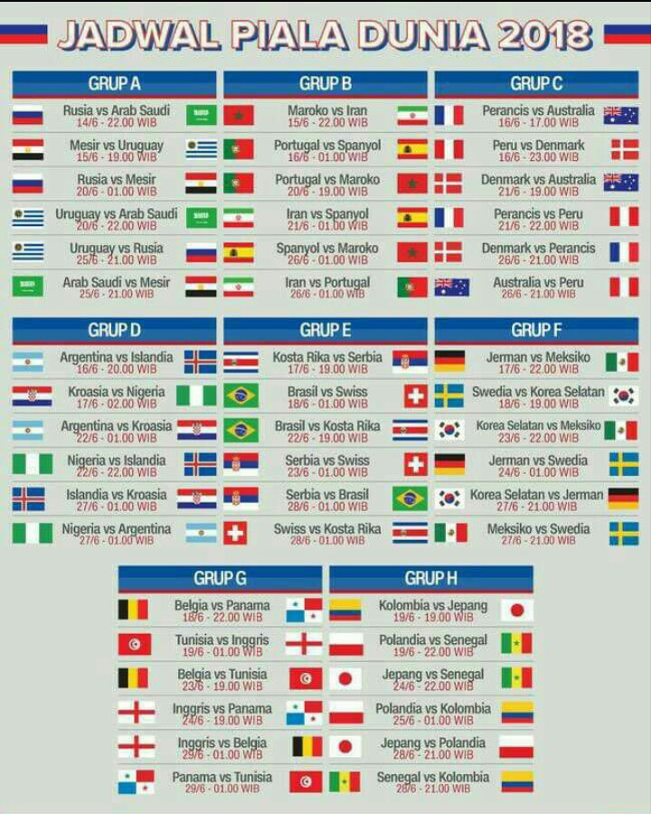 Berikut ini jadwal pertandingan fase grup Piala Dunia 2018.