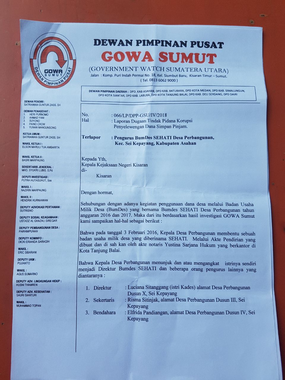 TASLABNEWS, ASAHAN– Ketua Umum Dewan Pimpinan Pusat Goverment Watch Sumatera Utara (Gowa Sumut) mengadukan kasus dugaan korupsi dana simpan pinjam Bumdes Sehati Desa Perbangunan ke Kejaksaan Negeri Kisaran.