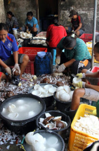 Para istri petani kelapa di Asahan sedang mencungkil daging kelapa yang akan dibuat tepung untuk di ekspor ke Inggris dan Belanda |