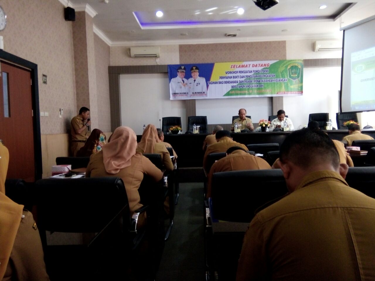 | Suasana Acara workshop penguatan fungsi teknis penyiapan bukti dan pengujian kelengkapan tagihan bagi bendahara dan pejabat penatausahaan keuangan yang berlansung di Aula kantor Bupati Labura. |