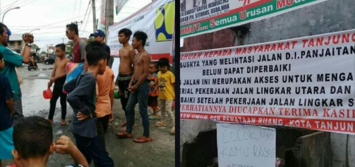 | Warga di Tanjungbalai menjadikan Jalan DI Panjaitan yang rusak jadi lokasi mandi, memancing dan menjala ikan. Sepanduk dari dinas PU yang menyatakan jalan belum bisa diperbaiki. |