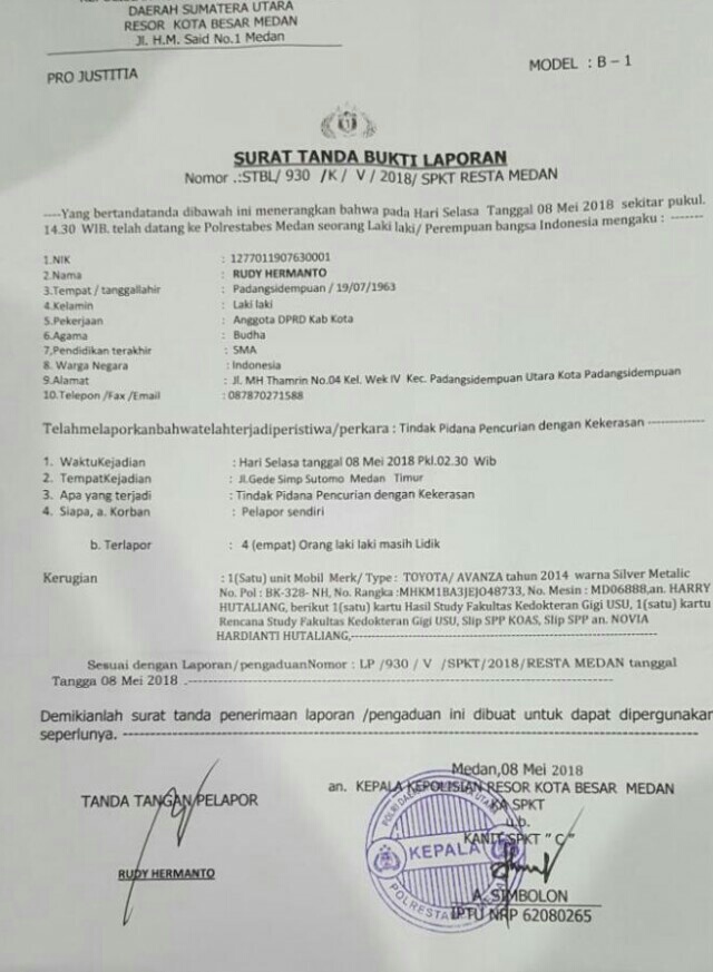 Atas kejadian tersebut, korban membuat laporan ke Polrestabes Medan dengan bukti lapor Nomor : STBL/930/KV/2018/SPKT RESTA MEDAN.