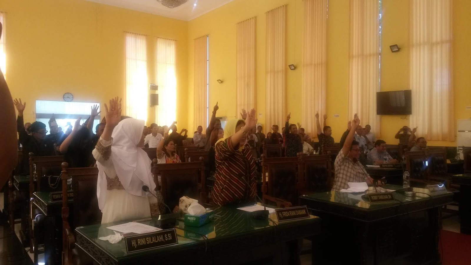 Anggota DPRD Siantar mengangkat tangan pertanda setuju jika Walikota Siantar disidang kasus penghinaan budaya Simalungun. |