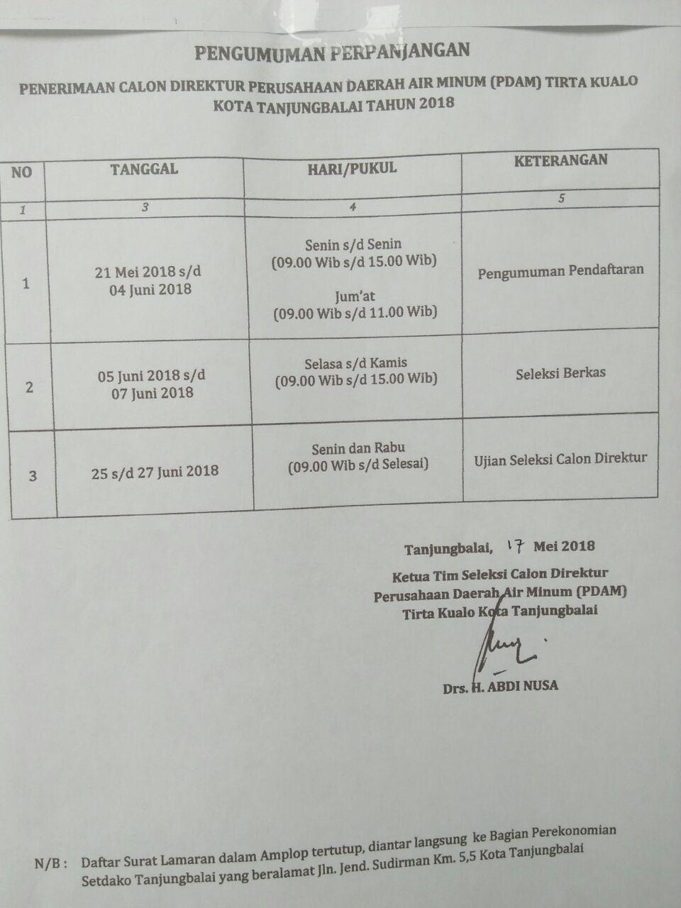 “Dalam pendaftaran tahap pertama dan kedua, yang mendaftarkan diri untuk menjadi calon Direktur PDAM Tirta Kualo, Kota Tanjungbalai hanya satu orang saja. Akibatnya, terpaksa pendaftaran calon Direktur PDAM Tirta Kualo diperpanjang untuk ketiga kalinya yakni dari tanggal 21 Mei hingga 4 Juni 2018 dan sudah ada tiga calon yang mendaftarkan diri”, ujar Dra Darul Yana Siregar.