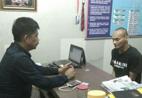 | Doni warga Sei Dadap Asahan tersangka pengedar narkoba saat diperiksa polisi. |