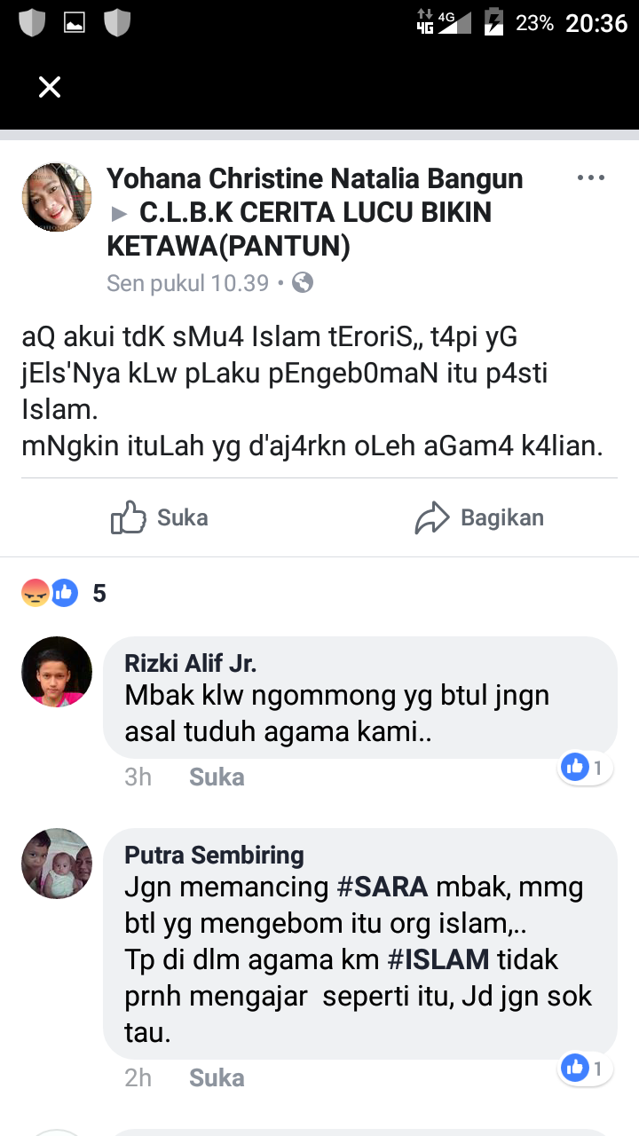 “aQ akui tdK sMu4 Islam tEroriS,, t4pi yG jEls’Nya kLw pLaku pEngeb0maN itu p4sti Islam. mNgkin ituLah yg d’aj4rkn oLeh aGam4 k4lian,” tulisnya pada Minggu (14/5), sekira pukul 20.39 Wib.