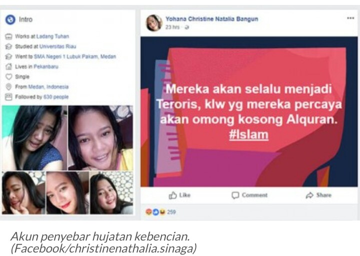 Informasi diperoleh, pemilik akun ini tercatat sebagai mahasiswi Universitas Riau dan tinggal di Kota Pekanbaru. Dalam postinganya ia melontarkan hujatan yang dinilai telah menghina dan menyebarkan kebencian terhadap umat Islam.