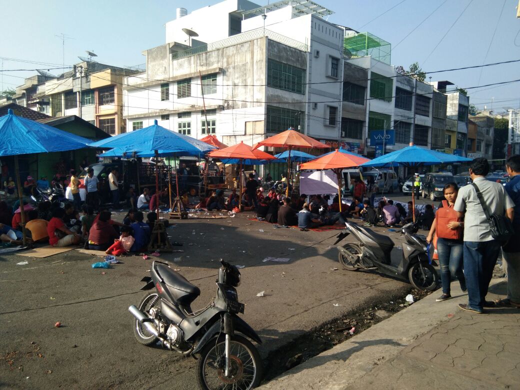 Dengan membentangkan spanduk panjang, pedagang menutup akses jalan Sutomo sehingga arus lalulintas terhenti total, tepat di samping gedung Pasar Horas.