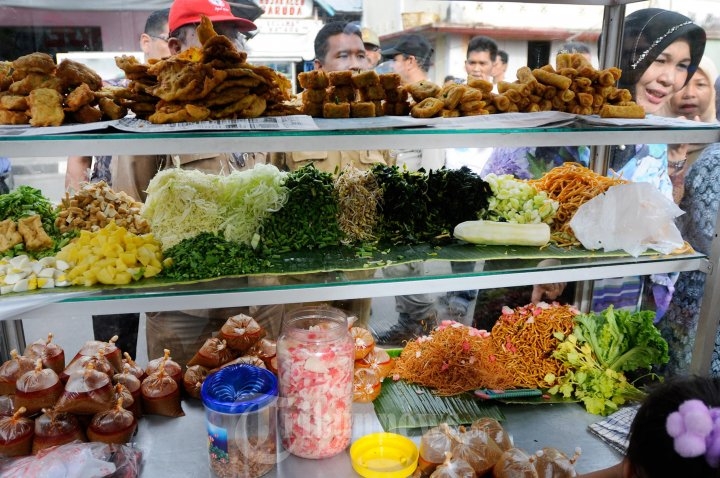 atas meja seperti urap, bubur pedas, batagor, kue talam pulut, kolding, gorengan, dan