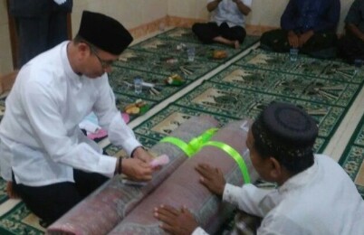 Tim safari Ramadan Pemkab Asahan menyerahkan bantyan sajadah gulung pada pengurus masjid. |
