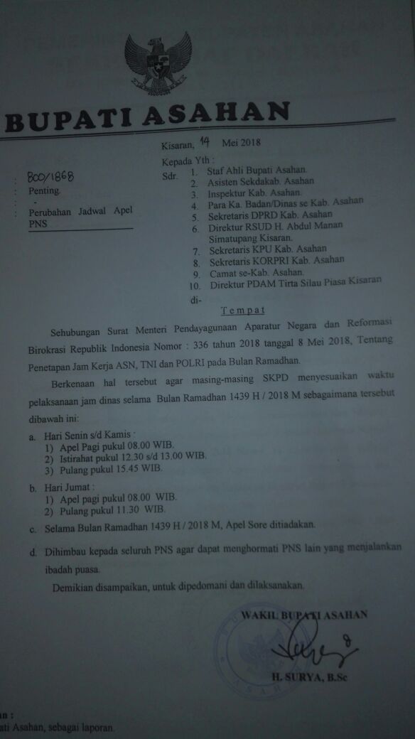 | Surat penetapan jam kerja PNS di Asahan. |