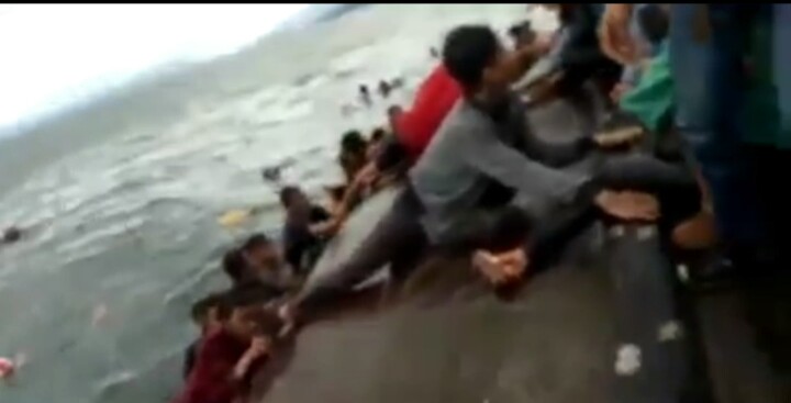 Dalam rekaman berdurasi 60 detik tersebut tampak para penumpang yang sudah berada diair berusaha naik ke atas kapal yang mulai jaram.
