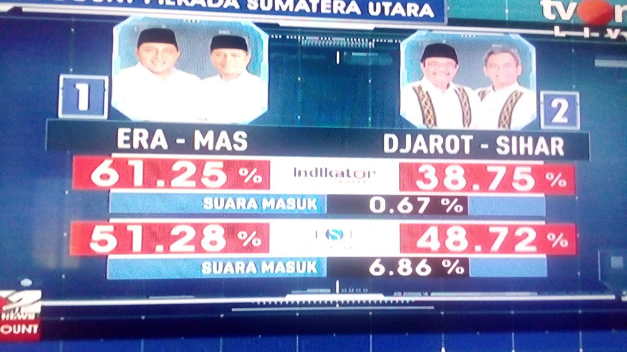 Berdasarkan data yang diterima dari laman resmi SMRC, sudah ada 15,67 persen data yang masuk. Pasangan Edi-Musa mendapatkan perolehan suara 65,73 persen, sedangkan pasangan Djarot-Sihar memperoleh 34,27 persen suara.
