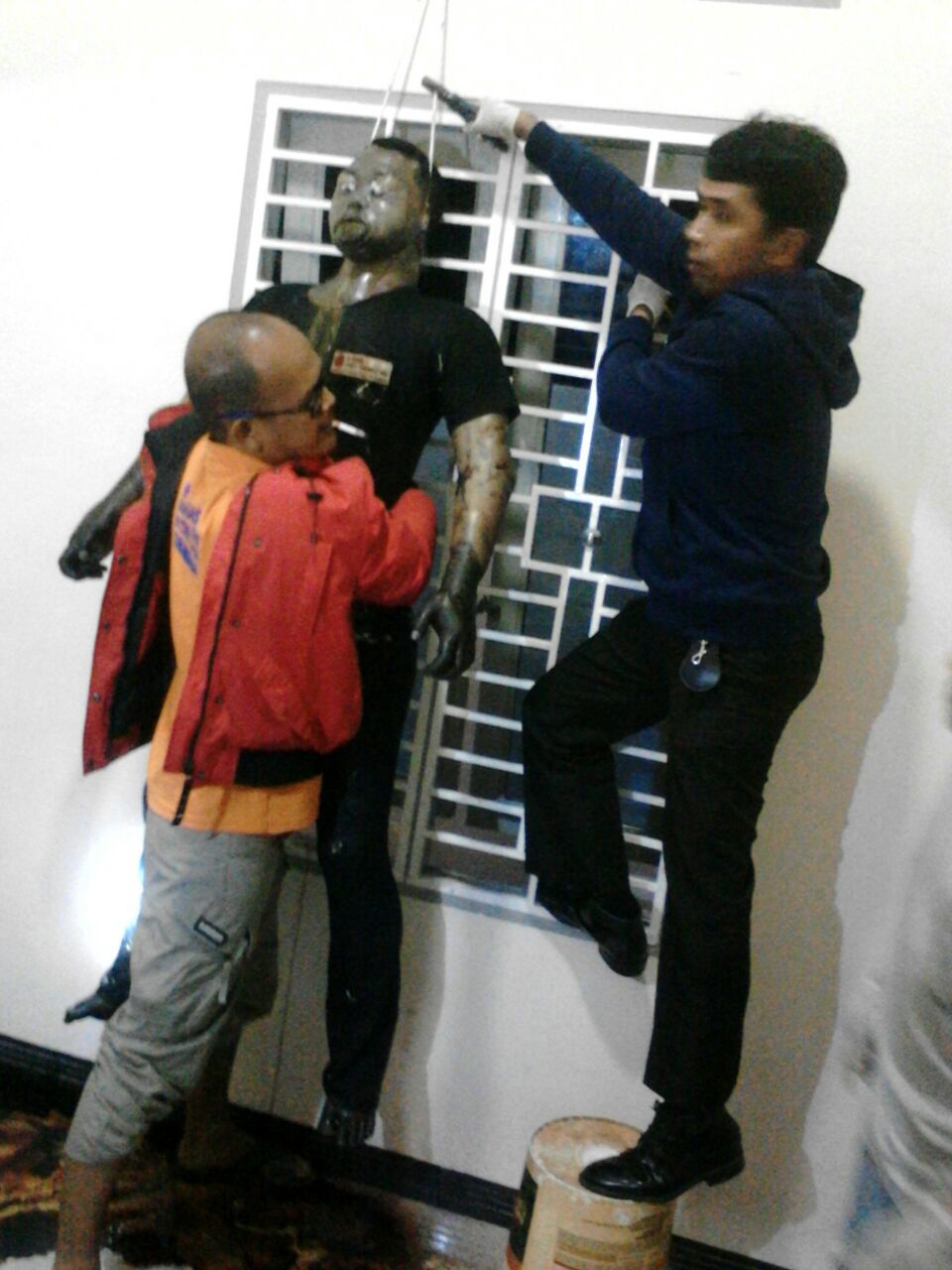 Korban ditemukan dalam keadaan gantung diri dengan kabel setrika di jerejak atas jendela dan mayatnya sudah membusuk dan menghitam